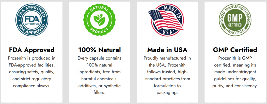 Manufactured in the USA under GMP-certified facilities, Prozenith ensures high quality and safety standards. This gives users peace of mind about the product’s production and ingredient integrity.